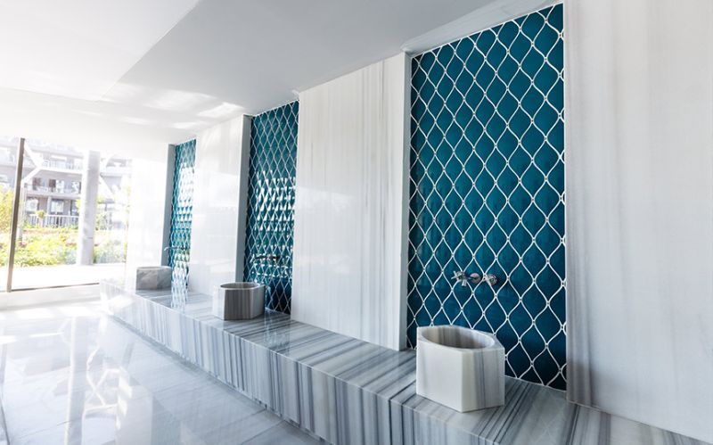 In the Bosphorus Sorgun hotel project, there are different marbles and our productions. In the lobby area, which is dominated by dark tones, we have made the areas more distinctive with our Volakas marble desk covering and Bluetta marble wall covering behind the desk. In our Turkish bath work in the spa area, we combined the traditional bath identity with modern lines. While we progressed more clearly and geometrically in forms, we did not leave the traditional concept in our material selection. We lightened the space and provided balance by using two different types of Marmara white marble that we use in our seats and coverings.