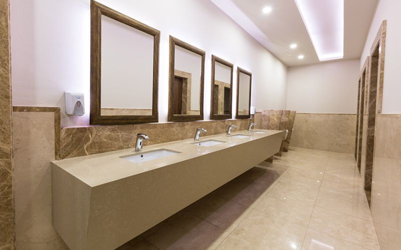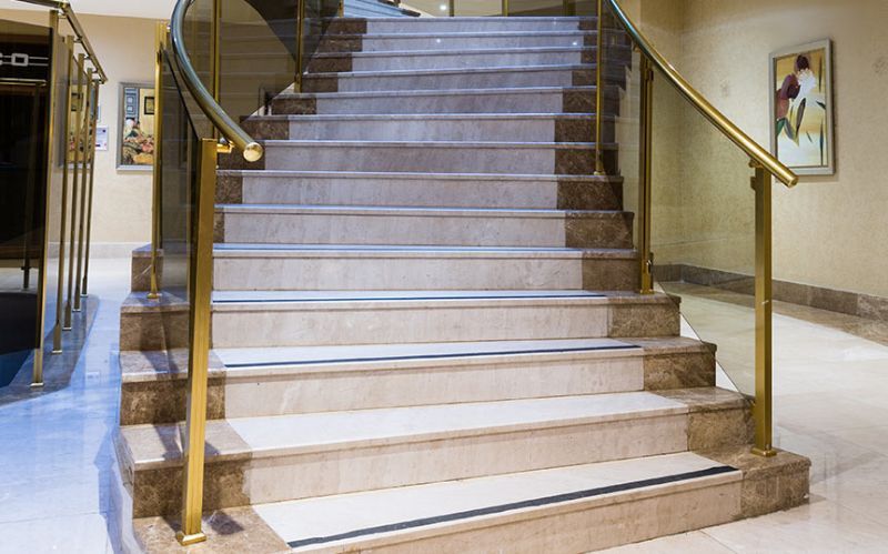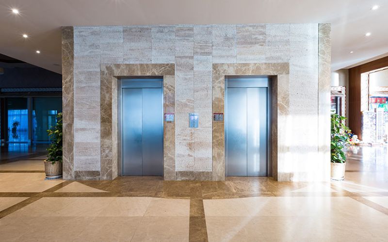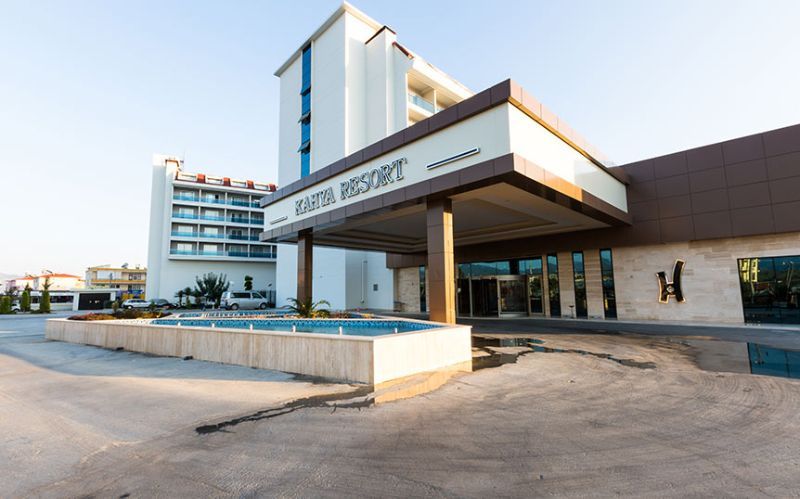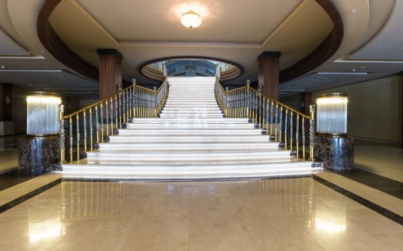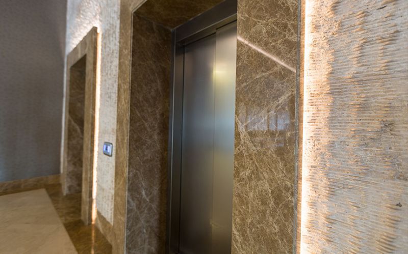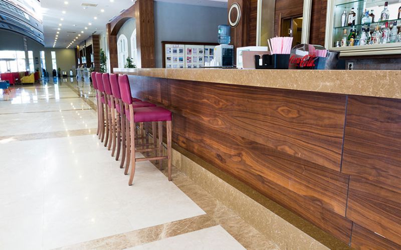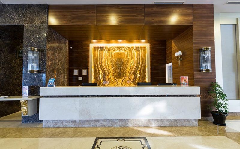 Kahya Resort Hotel, which operates in Alanya, has marble works both indoors and outdoors. At the entrance of the hotel, there are travertine and façade coatings. In the reception area, we benefited from the eye-catching feature of Onyx and worked as a bookmatch on the wall covering behind the desk. On the floor, we have used upholstery of light and dark beige tones with straight cut and waterjet cut patterns. We provided continuity in the space by using these patterns on the steps as well. We created led lighting detailed jambs from light beige marbles to surround the elevator doors, and we used this on the skirting boards as well. We applied light beige marbles as door jambs in the common use toilets in the same way, and we used our natural stones in bar counters and buffet counters.