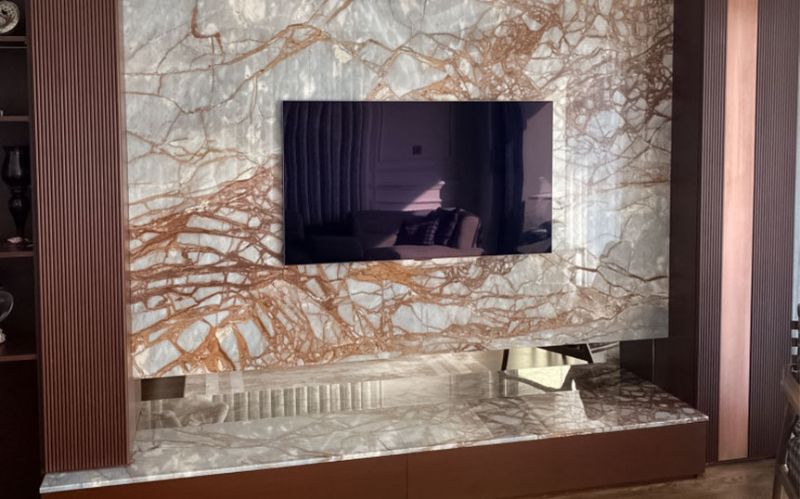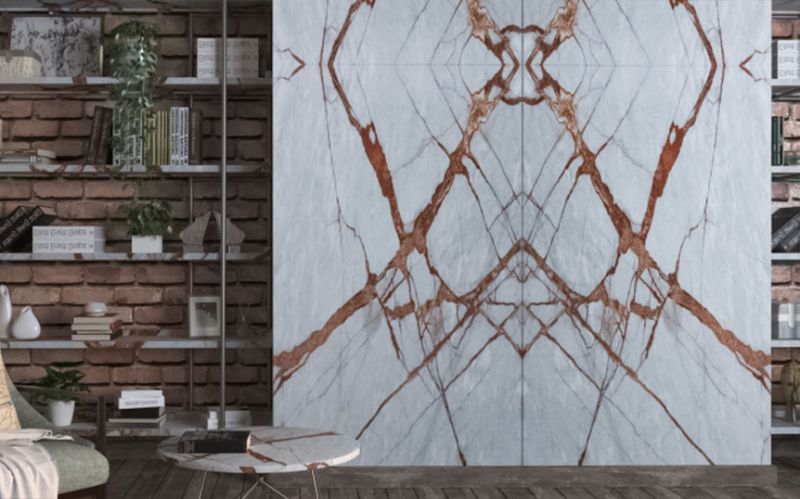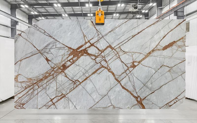 Lal taşı benzeri kristal damarlardan oluşan bir ağ, mavi ve fildişi lekeleriyle bezenmiş yumuşak, inci grisi bir arka planda parlıyor. Soğuk zemin ile yoğun, ışıltılı vurguların kontrastı görsel olarak parlaktır. Deep River, Türkiye'de çıkarılan bir mermer olup, 2cm cilalı olarak sunulmaktadır.