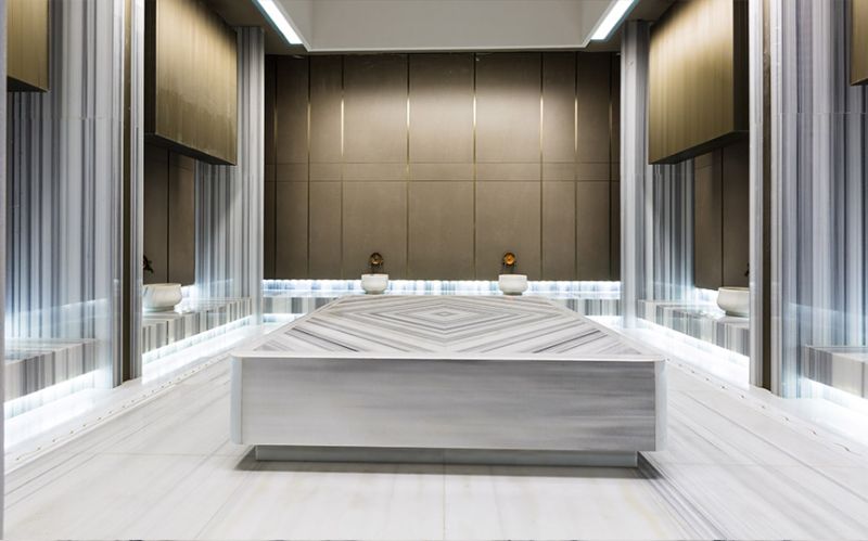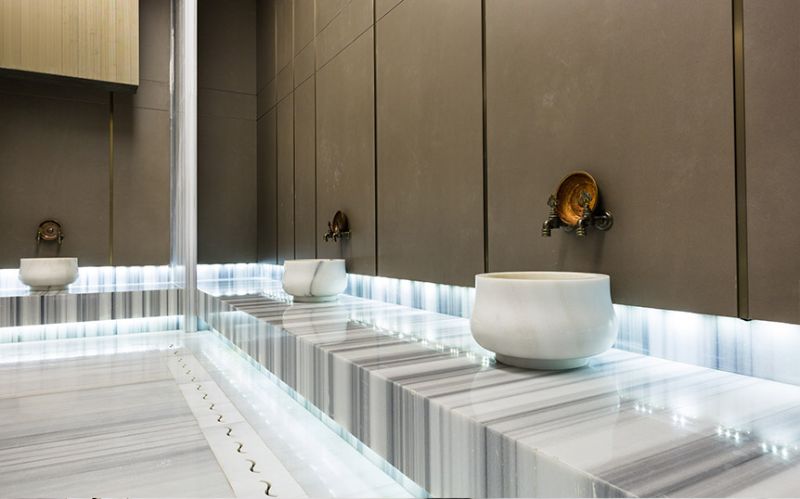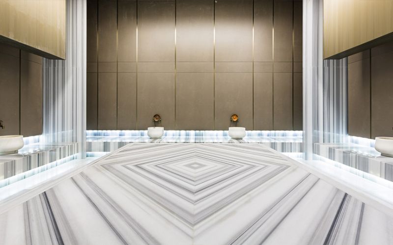 Turizm sektöründe önemli bir yere sahip olan Lavitas Hotel ile Türk hamamı projemizi hayata geçirdik. Görmeye alıştığımız hamam tarzının dışında, gizli aydınlatma detayının uygulandığı koyu kahve tonlarında seramiklerle kaplanan ve aralarında bronz çıtalara yer verilen duvar kaplamalarının ve oturma alanı zemin ve göbek taşındaki Marmara Beyaz mermerinin birleşimi, bize oldukça farkı bir hamam consepti ortaya çıkarmamızı sağladı. Hamamla birlikte lobi alanında bulunan kahverengi tonlardaki mermer basamak kaplama çalışmamız ile projeyi tamamladık.